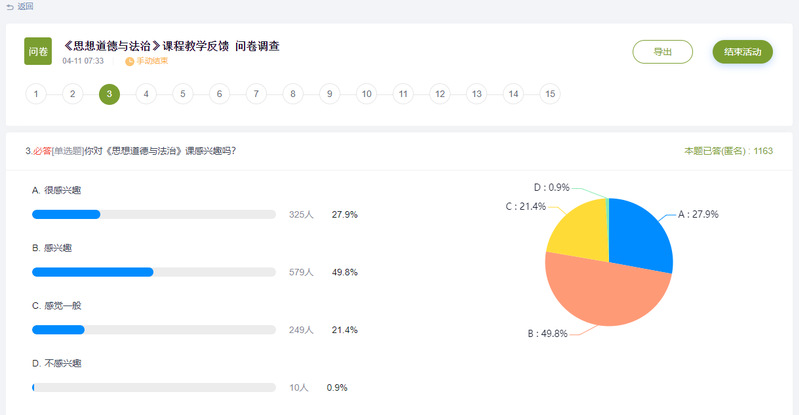 问卷调查结果显示,共有1163位员工参与作答,其中87.7%的员工对课程感兴趣,97%的员工表示满意教师的教学,98.8%的员工没有旷课的经历,88.9%的员工认为课程的学习让自身很有收获。另外,对于如何改进《思想道德与法治》课程的教学,70%以上的员工给出重要的建议。例如:提高教学案例的时效性,加强与员工的互动性等等。