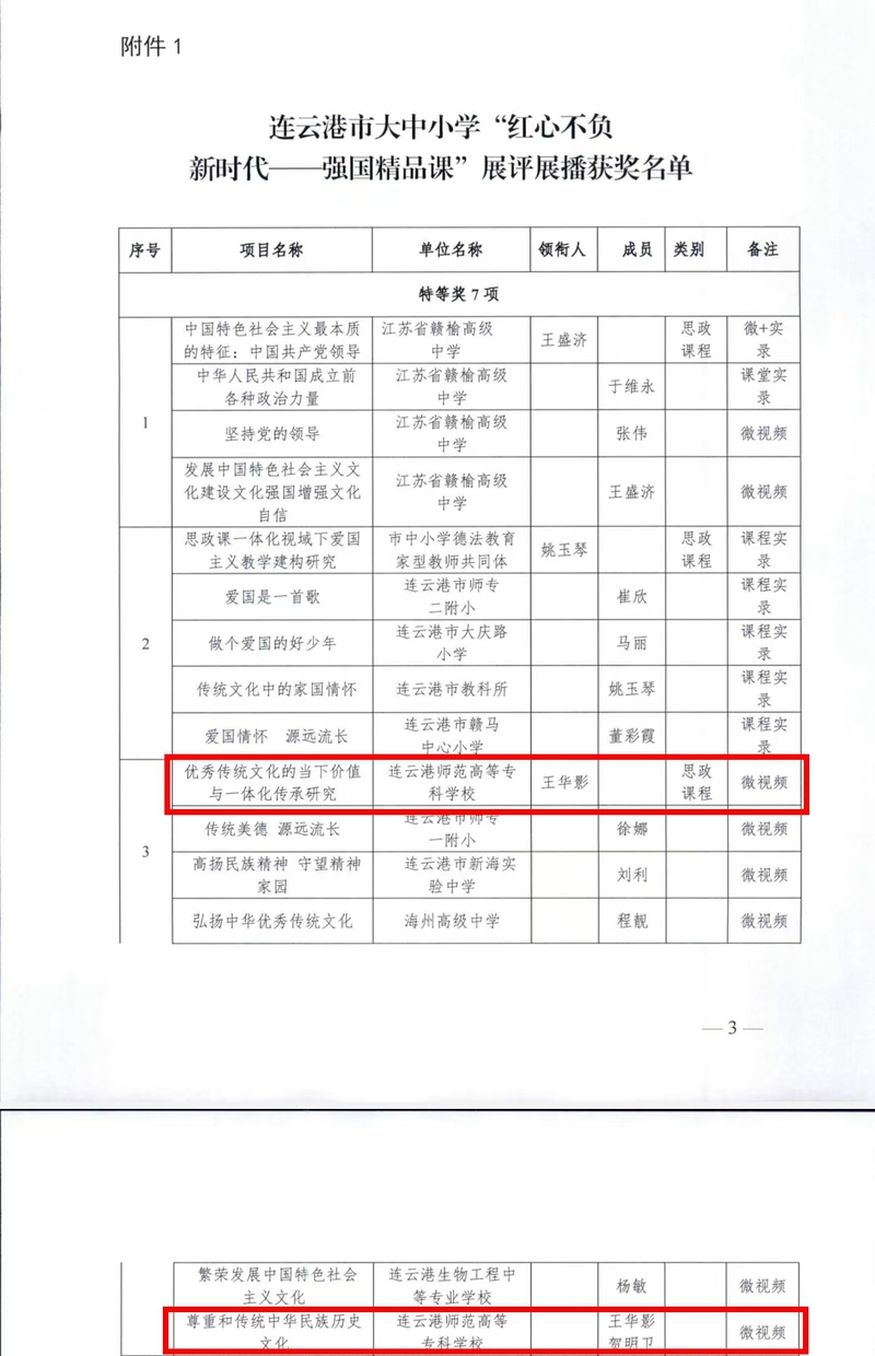 近日,连云港市教育局办公室公布了全市大中小学“红心不负新时代——强国精品课”展评展播获奖名单和优秀组织奖单位名单。我院王华影老师、贺明卫老师获特等奖,集团获优秀组织奖。